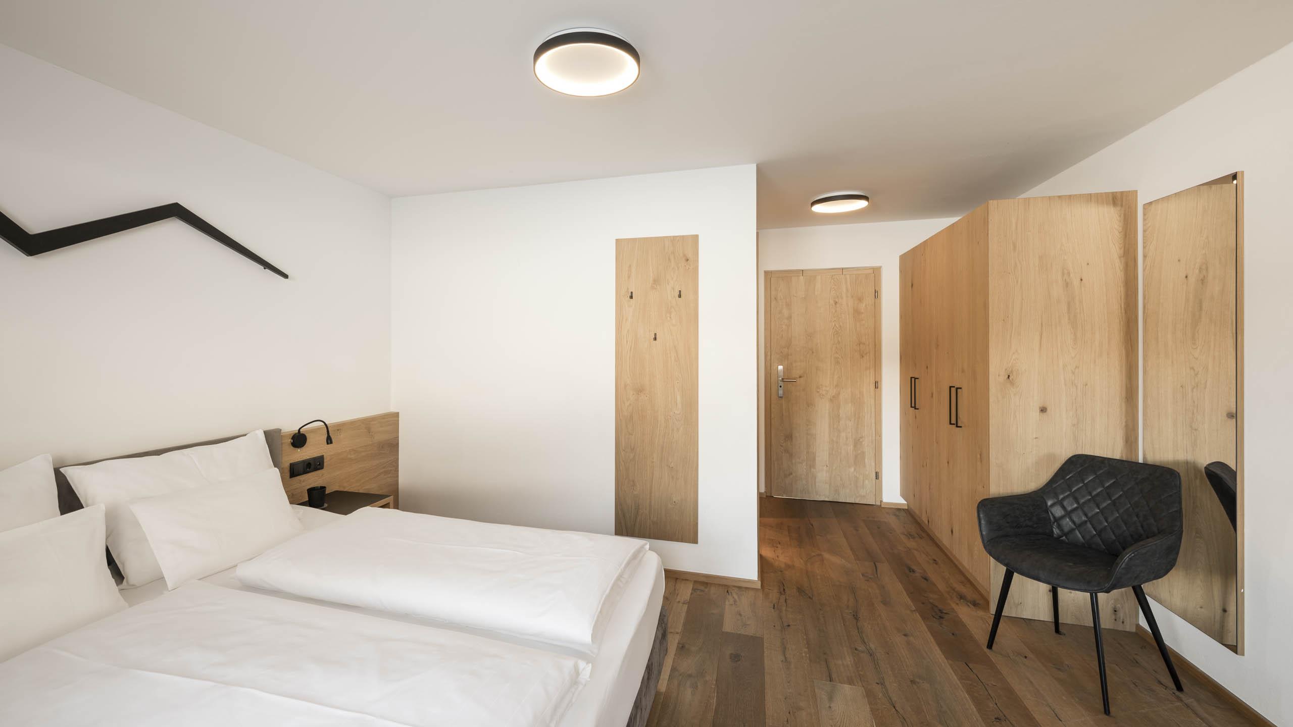 La Camera Matrimoniale Comfort colpisce per le sue dimensioni piacevoli e per l’atmosfera alpina accogliente. Caldi elementi in legno e molta luce naturale creano un ambiente confortevole, ideale per rilassarsi e sentirsi a proprio agio.